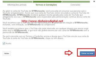 (No Exemplo abaixo o canal que esta sendo cadastrado já era parceiro do Adsense e por isso consta uma caixa de seleção “aceito” e outras informações que podem ser diferentes caso você ainda não tenha nenhuma parceira, devido a isto não se preocupe, basta clicar em ENTRAR PARA REDE