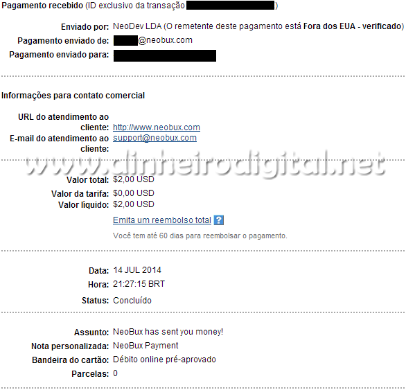 Recebi meu primeiro pagamento do PTC Neobux no valor de U$$ 2 dia 14/07/2014. O pagamento foi instantâneo.